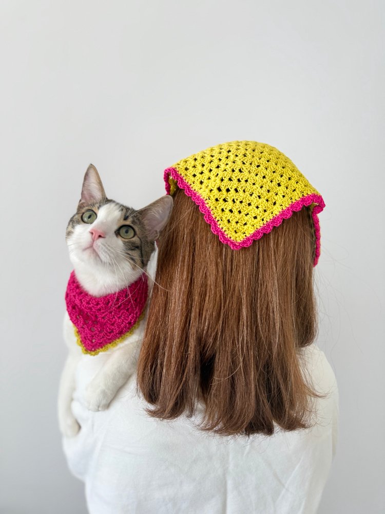 Özenle hazırladığımız, el yapımı tığ işi fular ve kedi bandanası seti.