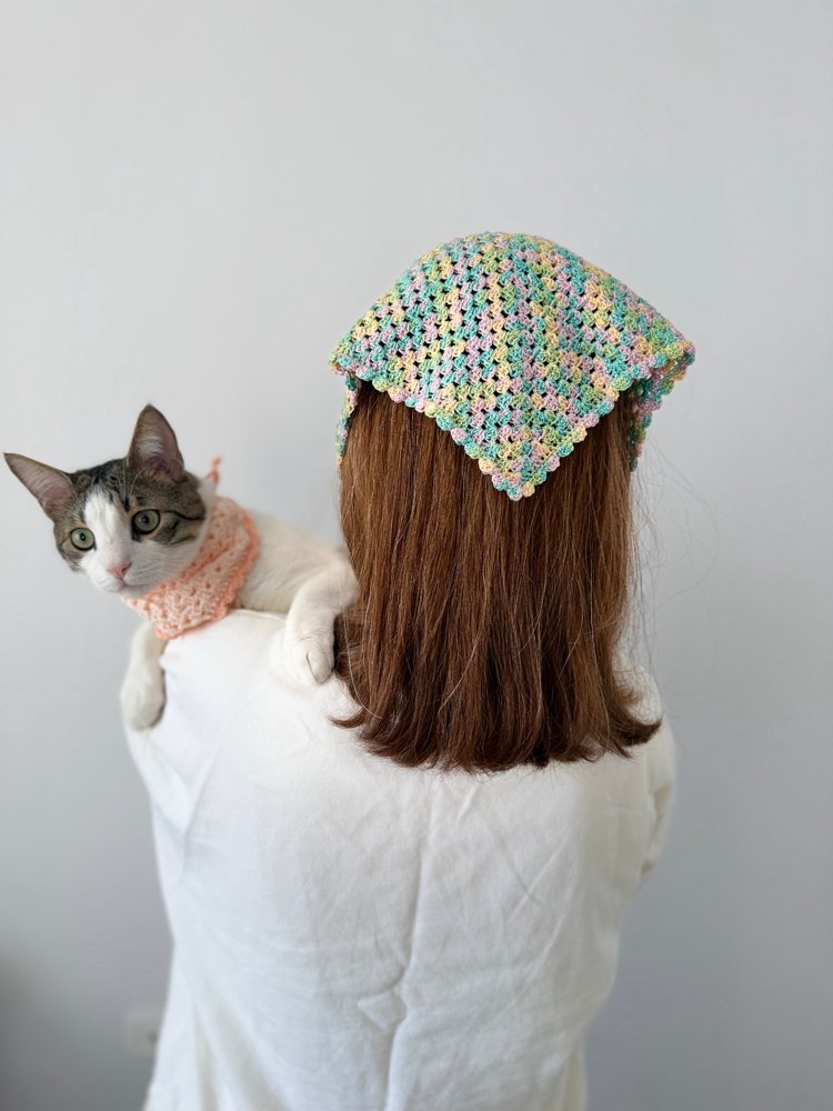 Özenle hazırladığımız, el yapımı tığ işi fular ve kedi bandanası seti.