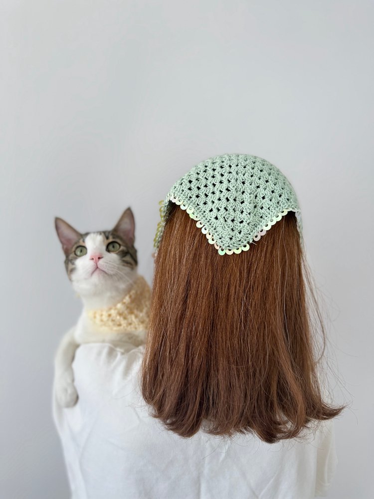 Özenle hazırladığımız, el yapımı tığ işi fular ve kedi bandanası seti.